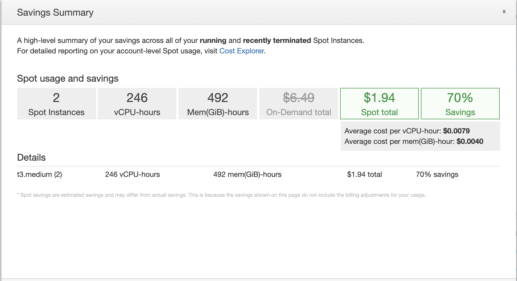 ဒီပုံမှာပြထားတာကတော့ Saving Summary ပါ။ ကျွန်တော်သုံးထားတာကတော့ T3.medium instance ၂လုံးကို ၃ရက်လောက်သုံးထားပါတယ်။ On-demand Price ဆိုရင်တော့ $6.49 လောက်ကျသွားမယ်ပေါ့နော်။ Spot Instance နဲ့သုံးမယ်ဆိုရင်တော့ ၃ရက်စာ ၇၂နာရီကို $1.94 လောက်ပဲကျပါတယ်။ ဒါ့အပြင် စျေးအရမ်းသက်သာနေလို့ On-demand Instance တွေလို Performance ကောင်းရဲ့လား၊ Specification ရောလျော့သွားလား ဘာညာစတာတွေ ပူစရာမလိုပါဘူး၊ Spot Instance ကလည်း On-Demand Instance တွေကိုသုံးသလိုပဲ အလွယ်တစ်ကူအသုံးပြုလို့ရပါတယ်။ ပြောင်းလဲလာတဲ့ Spot Instance Pricing Model အရလည်း အရင်လို Bidding တွေအတွက် ခေါင်းရှုပ်စရာမလိုတော့ပါဘူး။